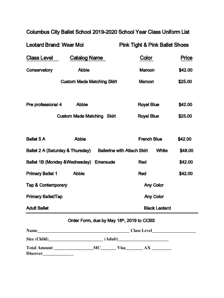 Columbus City Ballet School 20192020 School Year Class Uniform List Leotard Brand: Wear Moi Class Leveling Tight & Pink Ballet ShoesCatalog NameConservatoryAbbie Custom Made Matching Skirt professional