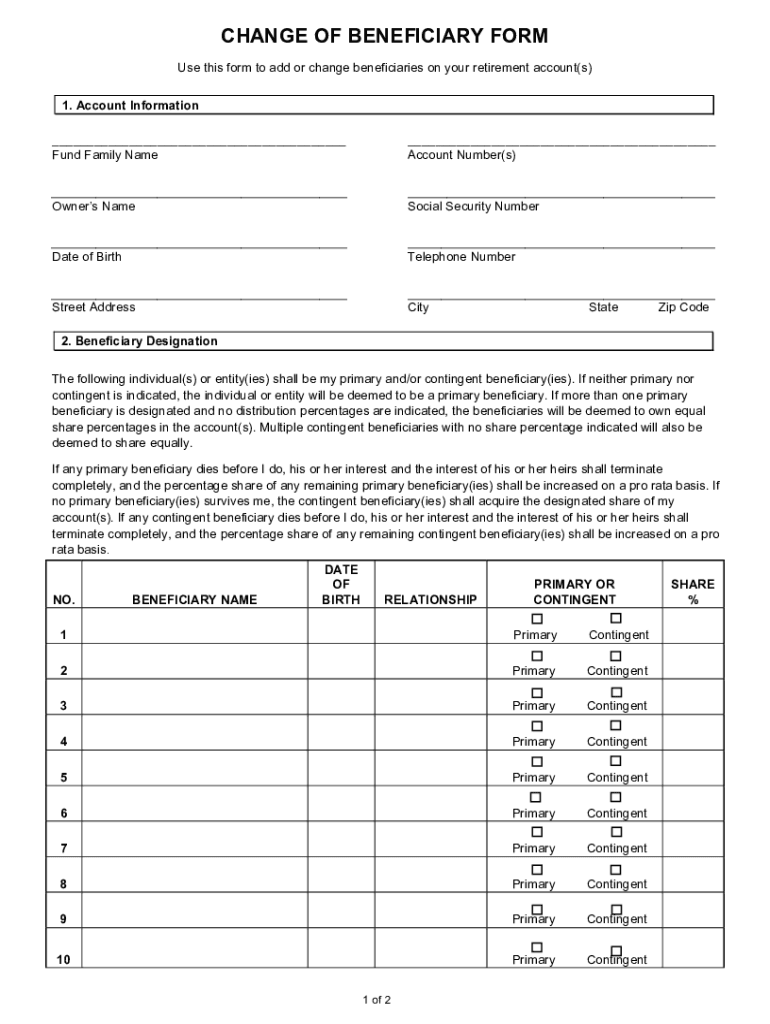 CHANGE OF BENEFICIARY FORM Use this form to add or change beneficiaries on your retirement account(s) 1. Account Information Fund Family Name Account Number(s) Owners Asocial Security Number Date