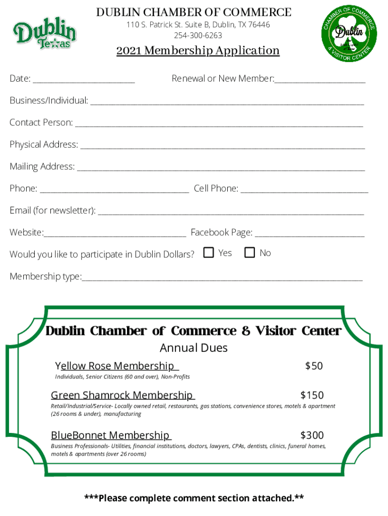 DUBLIN CHAMBER OF COMMERCE 110 S. Patrick St. Suite B, Dublin, TX 76446 25430062632021 Membership Application Date: Renewal or New Member: Business/Individual: Contact Person: Physical Address: Mailing