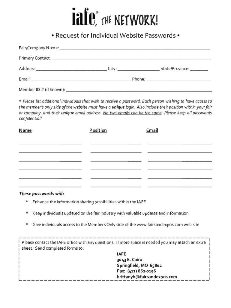 Request for Individual Website Passwords Fair/Company Name: Primary Contact: Address: City: State/Province: Email: Phone: Member ID # (if known): * Please list additional individuals that wish to