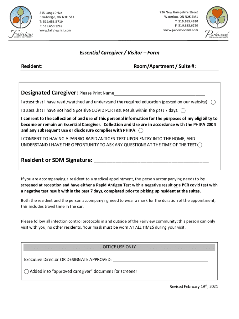 Essential care giver form can typically be filled out online or in person at the facility. It usually requires basic information about the caregiver and the resident they intend to visit.