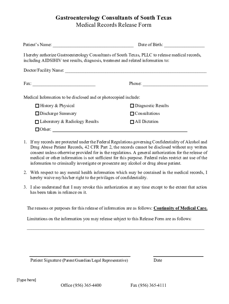Gastroenterology Consultants of South Texas Medical Records Release Form Patients Name: Date of Birth: I hereby authorize Gastroenterology Consultants of South Texas, LLC to release medical records,