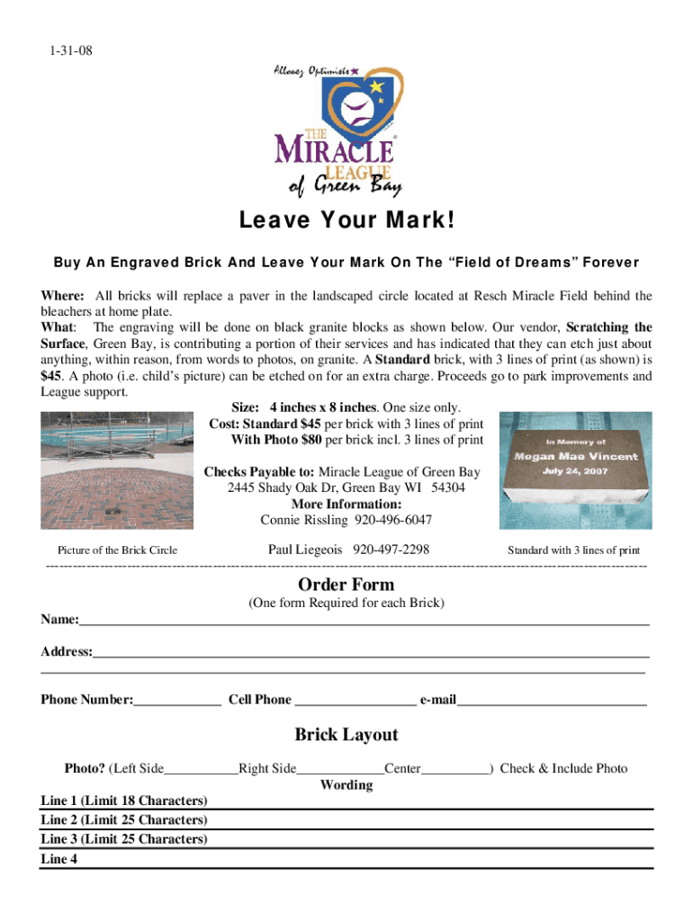 Where: All bricks will replace a paver in the landscaped circle located at Reach Miracle Field behind