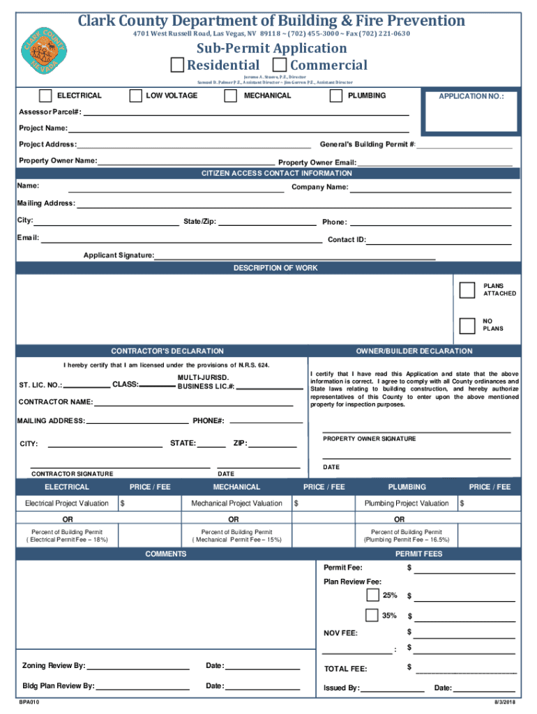 Clark County Department of Building & Fire Prevention 4701 West Russell Road, Las Vegas, NV 89118 (702) 4553000 Fax (702) 2210630SubPermit Application Commercial Residential Jerome A. Steve, P.E.,