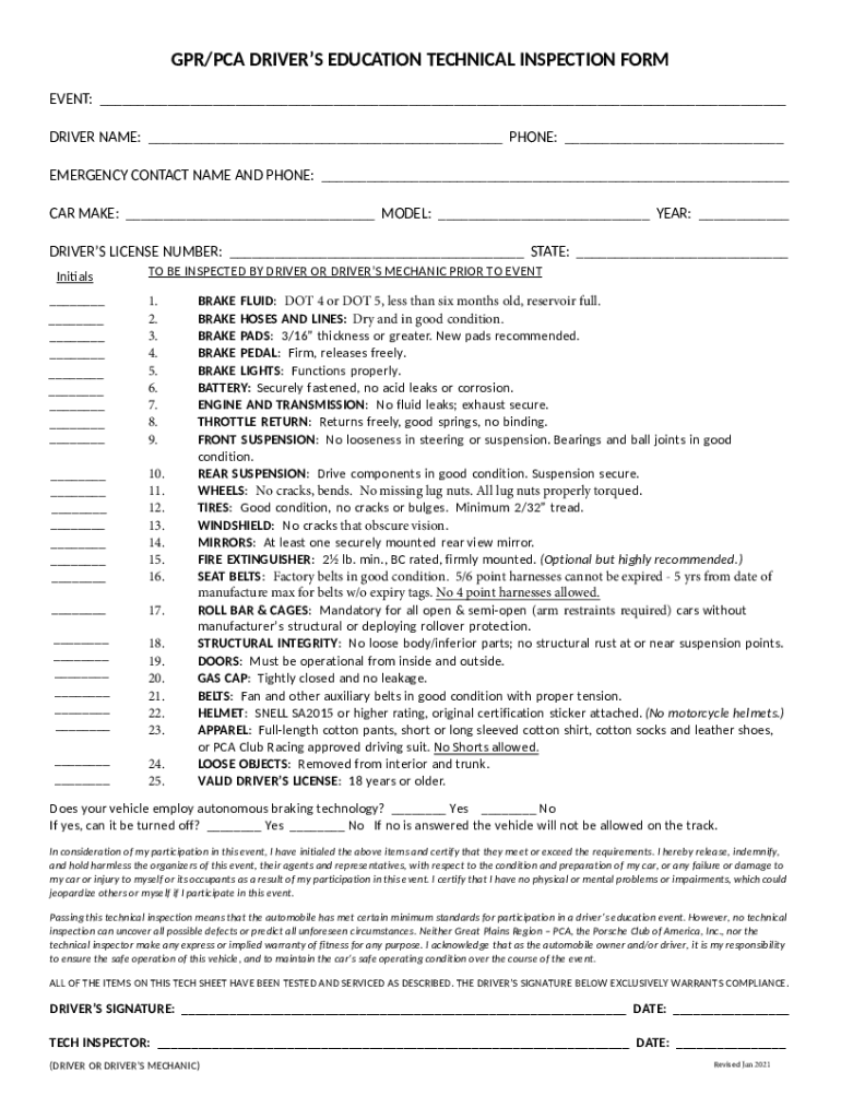 GPR/PCA DRIVERS EDUCATION TECHNICAL INSPECTION FORM EVENT: DRIVER NAME: PHONE: EMERGENCY CONTACT NAME AND PHONE: CAR MAKE: MODEL: YEAR: Driver's LICENSE NUMBER: STATE: Initials TO BE INSPECTED BY