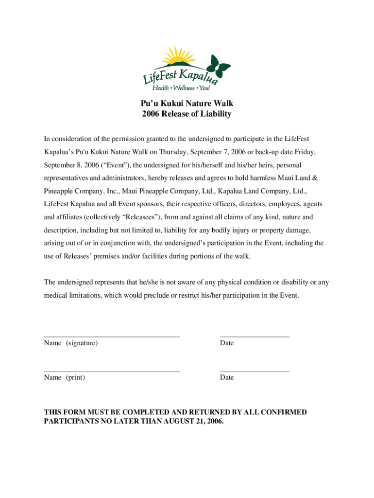 Pub Kiki Nature Walk 2006 Release of Liability In consideration of the permission granted to the undersigned to participate in the Liefest Kampala Pu 'u Kiki Nature Walk on Thursday, September 7,