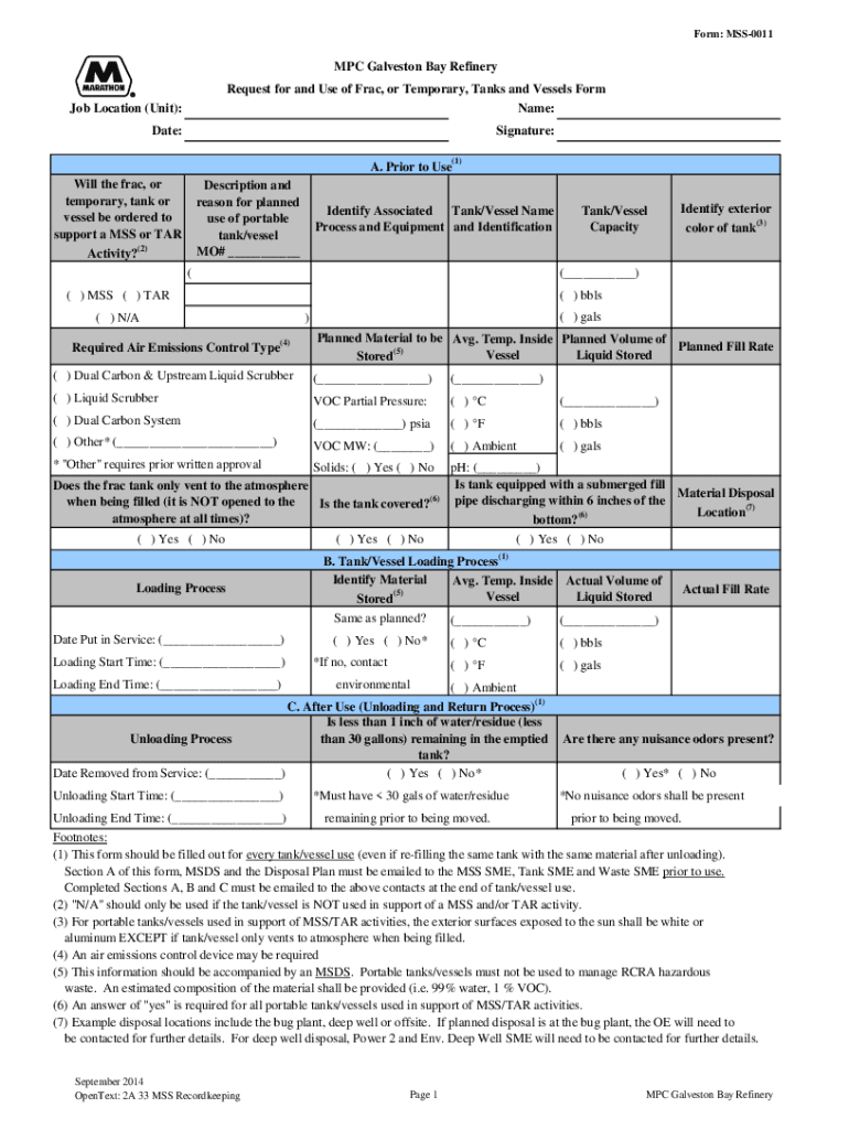 Form: MSS0011MPC Galveston Bay Refinery Request for and Use of Franc, or Temporary, Tanks and Vessels Form Name:Job Location (Unit): Date:Signature: A. Prior to Use(1)Will the franc, or temporary,