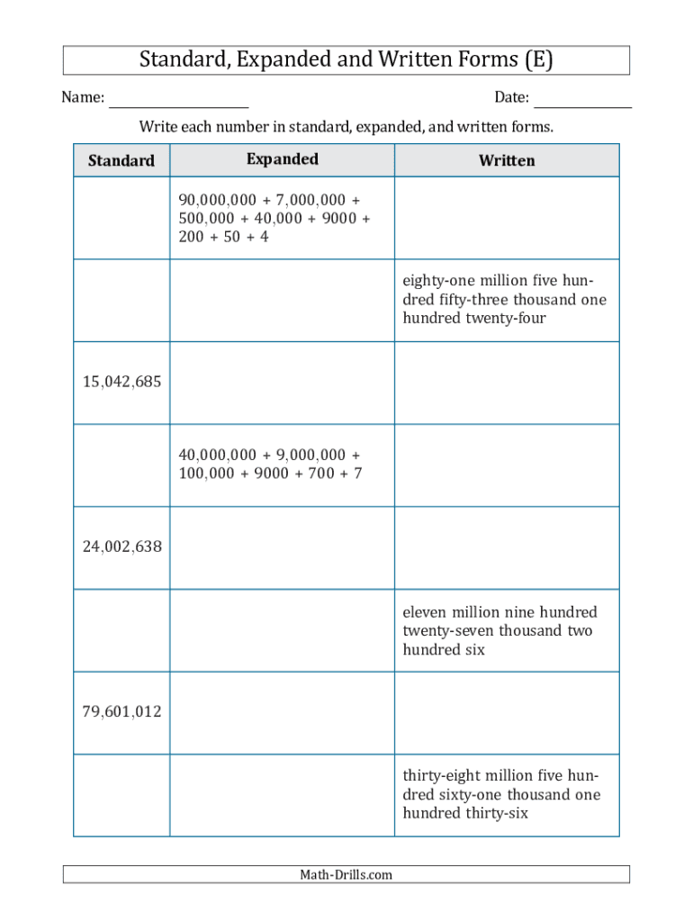 Get the free Number Sense Worksheet -- Converting Between Standard, Expanded and Written Forms (8...