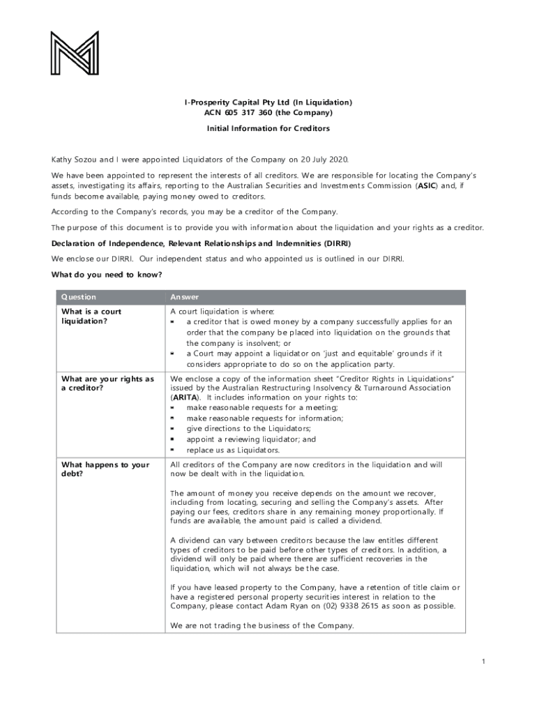 Initial Information for Creditors Kathy Soon and I were appointed Liquidators of the Company on 20 July 2020.