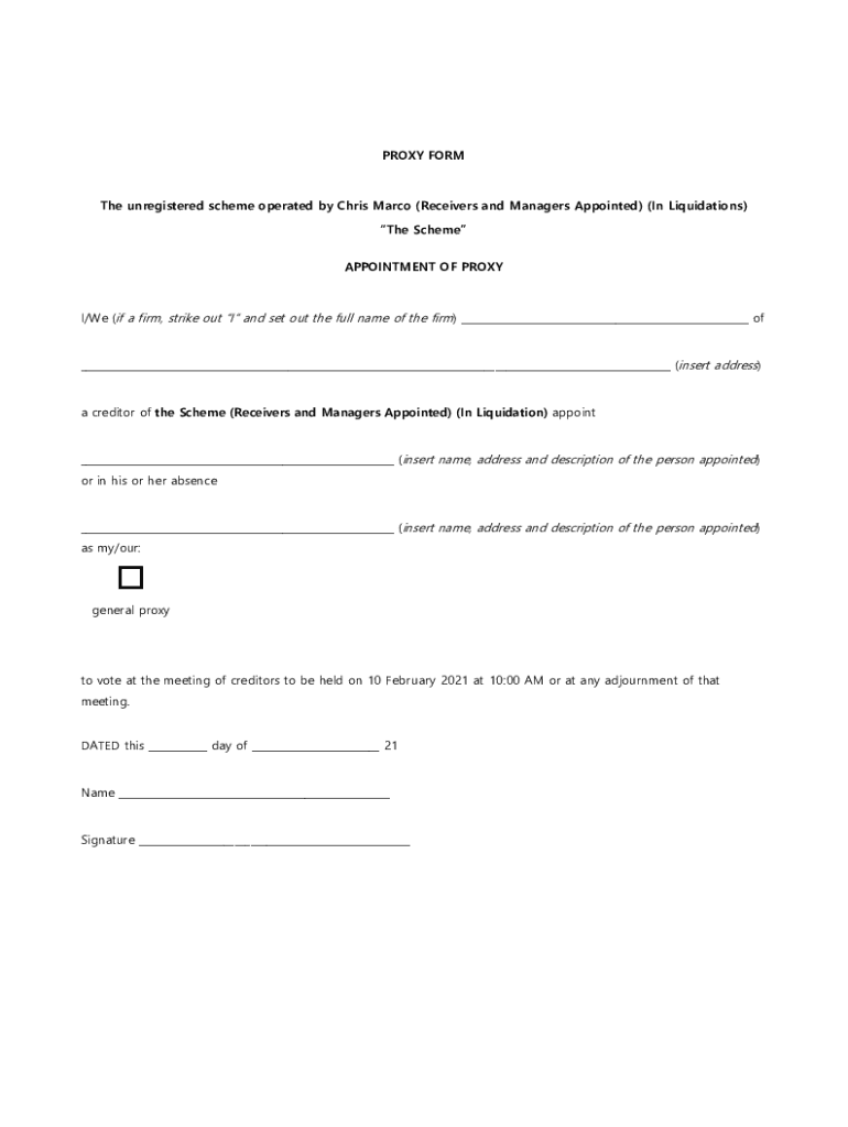 PROXY Forth unregistered scheme operated by Chris Marco (Receivers and Managers Appointed) (In Liquidations) The Scheme APPOINTMENT OF PROXY/We (if a firm, strike out I and set out the full name of