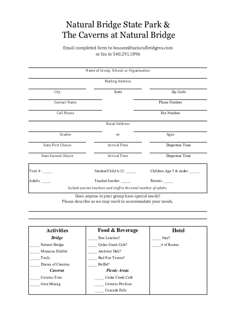 Natural Bridge State Park & The Caverns at Natural Bridge Email completed form to Moore naturalbridgeva.com or fax to 540.291.1896 Name of Group, School, or Organization Mailing Address CityStateZip