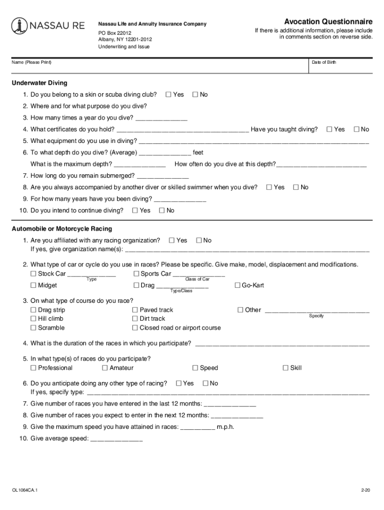 Avocation Questionnaire Nassau Life and Annuity Insurance Company there is additional information, please include in comments section on reverse side. PO Box 22012 Albany, NY 122012012 Underwriting