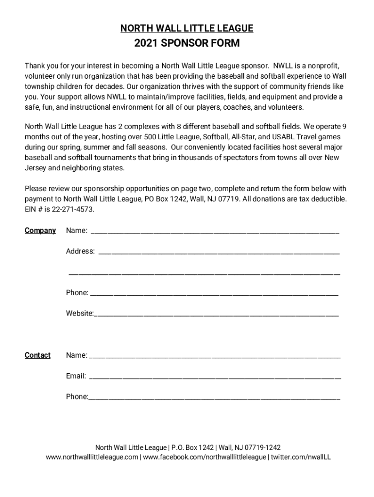 NORTH WALL LITTLE LEAGUE2021 SPONSOR FORM Thank you for your interest in becoming a North Wall Little League sponsor. NULL is a nonprofit, volunteer only run organization that has been providing the