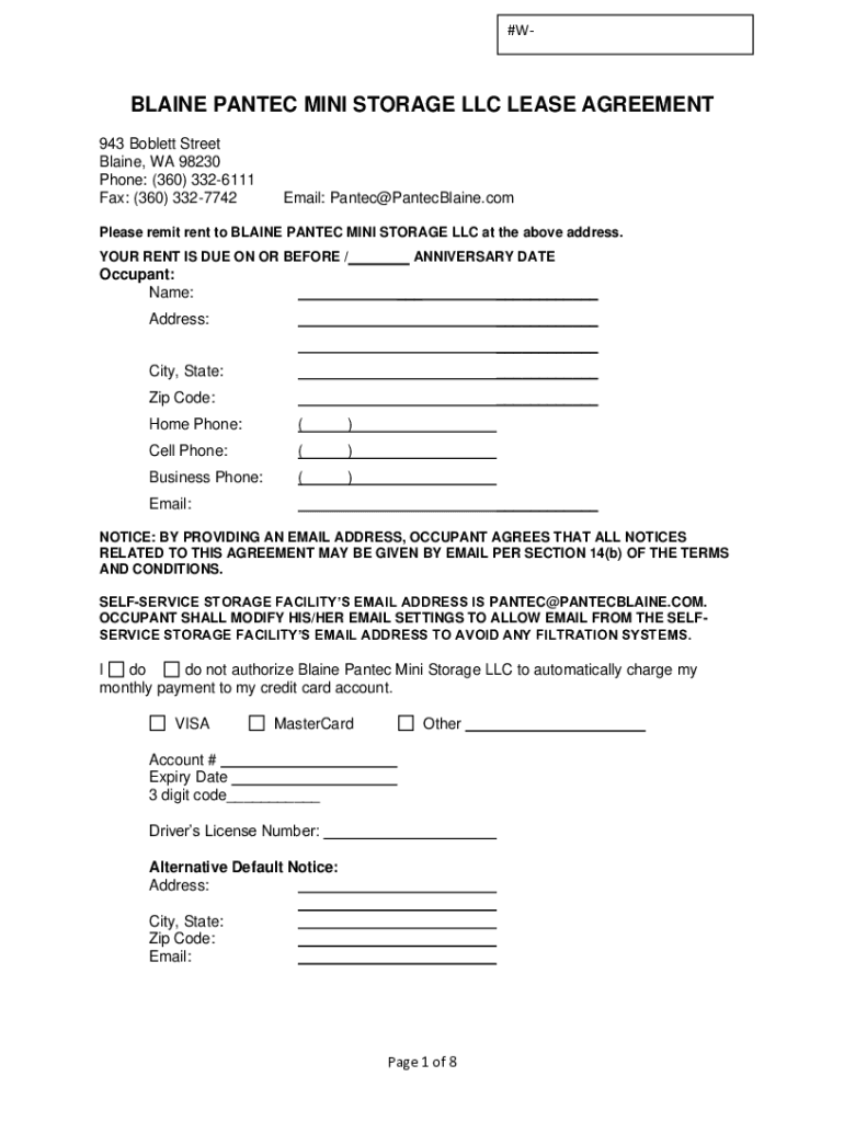 #BLAINE PANTED MINI STORAGE LLC LEASE AGREEMENT 943 Goblet Street Blaine, WA 98230 Phone: (360) 3326111 Fax: (360) 3327742Email: Panted PantecBlaine. Complete remit rent to BLAINE PANTED MINI STORAGE