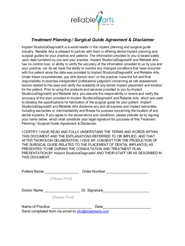 Treatment Planning / Surgical Guide Agreement & Disclaimer Implant Studio/diagnostic is a world leader in the implant planning and surgical guide industry. Reliable Arts is pleased to partner with