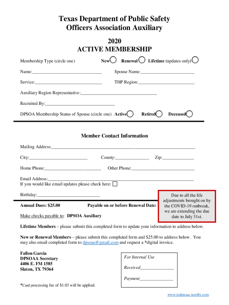 Texas Department of Public Safety Officers Association Auxiliary 2020 ACTIVE MEMBERSHIP Type (circle one)NewRenewalLifetime (updates only)Name: Spouse Name: Service: THP Region: Auxiliary Region Representative: