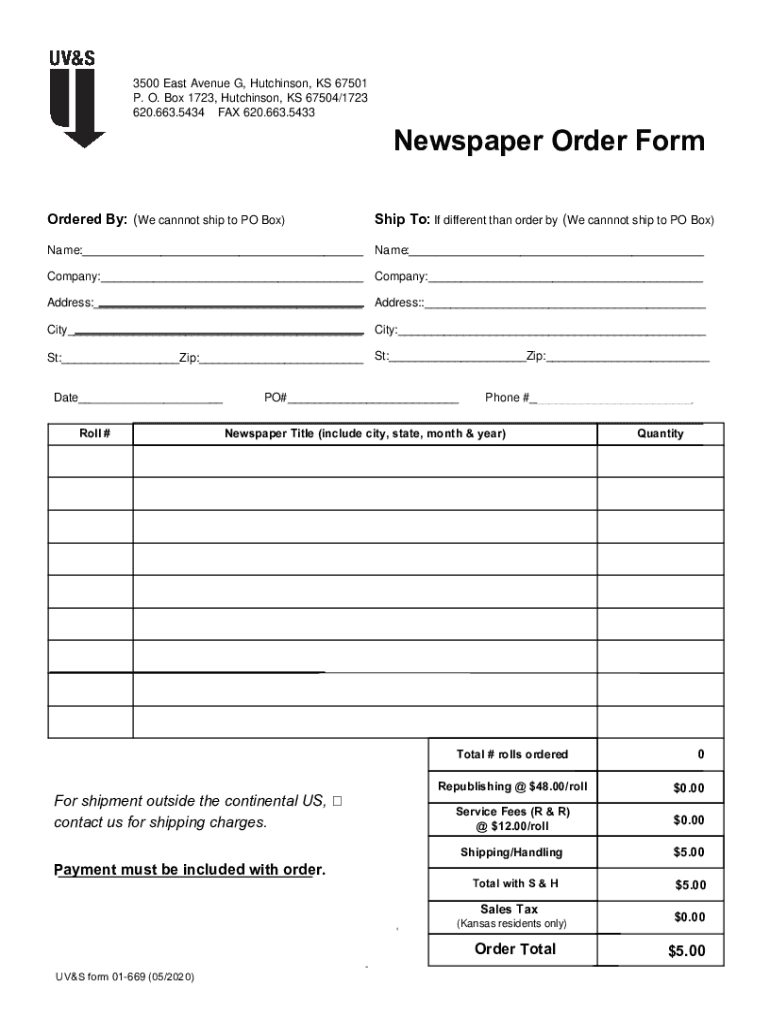 3500 East Avenue G, Hutchinson, KS 67501 P. O. Box 1723, Hutchinson, KS 67504/1723 620.663.5434 FAX 620.663.5433Newspaper Order Form Ordered By: (We cannot ship to PO Box)Ship To: If different from