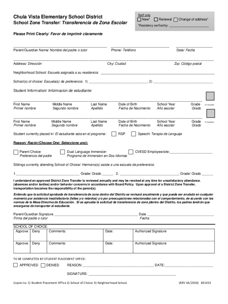 Staff onlyChula Vista Elementary School District School Zone Transfer/ Transference DE Zone Escolar×RenewalChange of address**Residency verified by: Please Print Clearly/ Favor de Imprimis Clarence