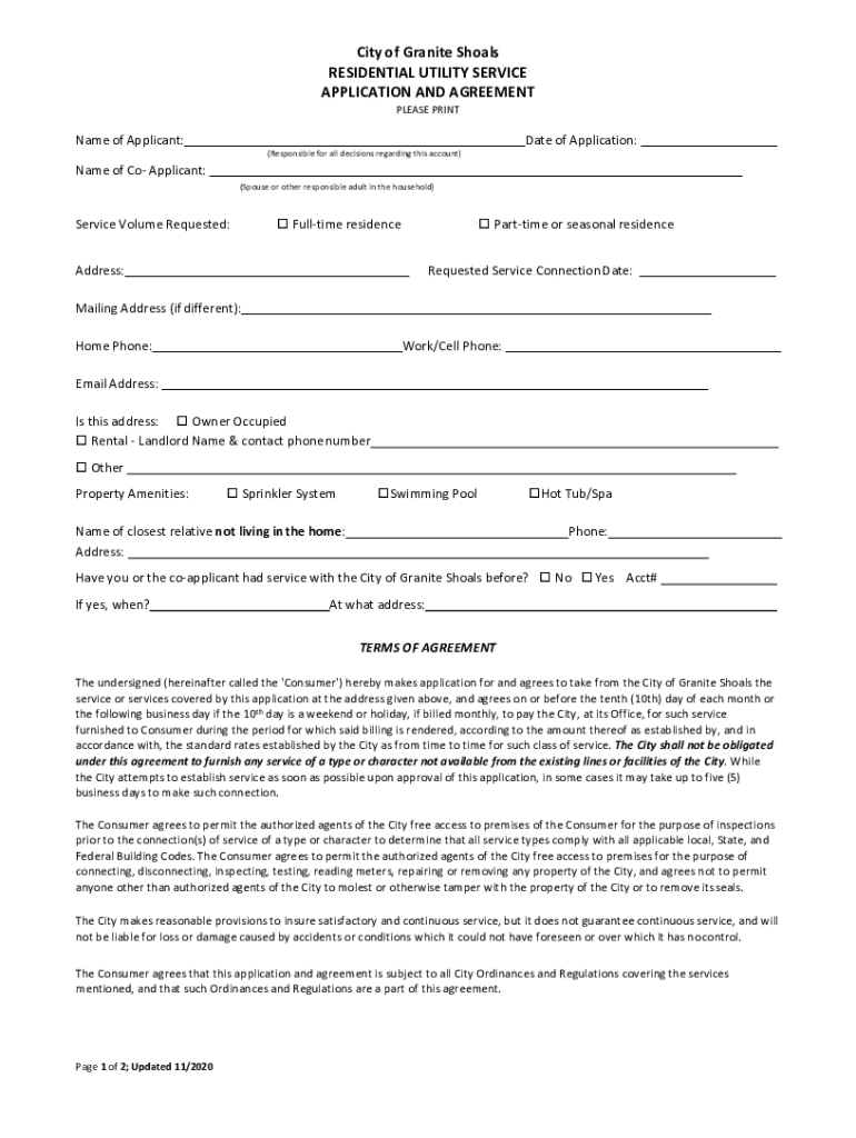 City of Granite Shoals RESIDENTIAL UTILITY SERVICE APPLICATION AND AGREEMENT PLEASE Printable of Applicant:Date of Application:(Responsible for all decisions regarding this account)Name of Co Applicant: