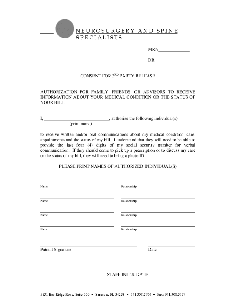 NEUROSURGERY AND SPINE SPECIALISTS MAN DR CONSENT FOR 3RD PARTY RELEASEAUTHORIZATION FOR FAMILY, FRIENDS, OR ADVISORS TO RECEIVE INFORMATION ABOUT YOUR MEDICAL CONDITION OR THE STATUS OF YOUR BILL.