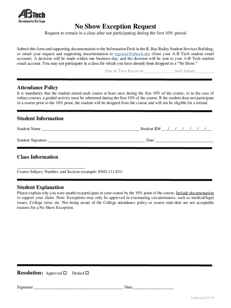 No Show Exception Request to remain in a class after not participating during the first 10% periodSubmit this form and supporting documentation to the Information Desk in the K. Ray Bailey Student
