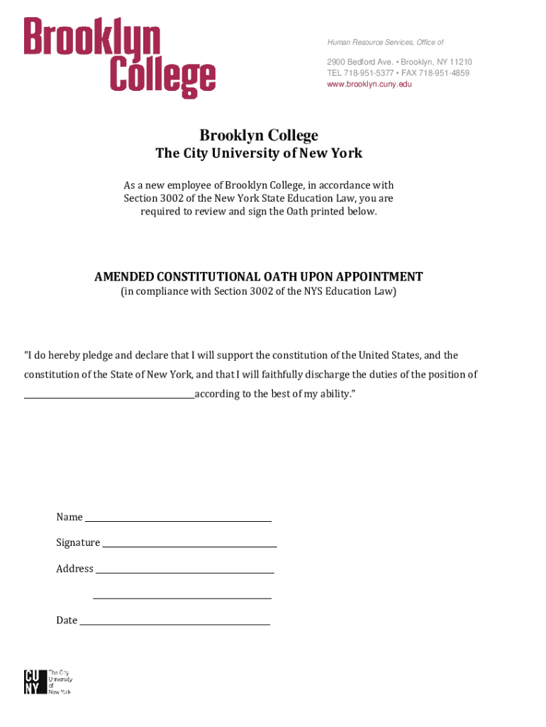 Human Resource Services, Office of2900 Bedford Ave. Brooklyn, NY 11210 TEL 7189515377 FAX 7189514859 www.brooklyn.cuny.eduBrooklyn College City University of New York As a new employee of Brooklyn