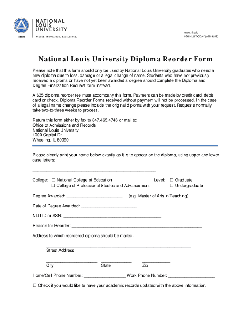 National Louis University Diploma Reorder Form
