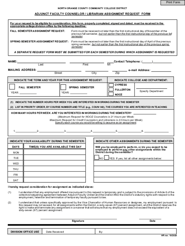 NORTH ORANGE COUNTY COMMUNITY COLLEGE DISTRICTADJUNCT FACULTY COUNSELOR / LIBRARIAN ASSIGNMENT REQUEST FORM