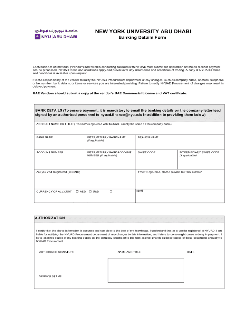 NEW YORK UNIVERSITY ABU DHABI Banking Details Former business or individual (“Vendor “) interested in conducting business with NY UAD must submit this application before an order or payment can