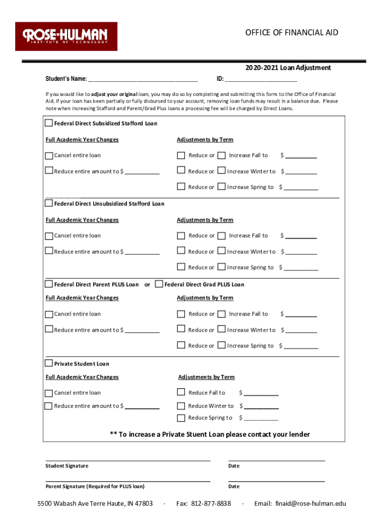 OFFICE OF FINANCIAL AID20202021 Loan Adjustment Students Name: ID: If you would like to adjust your original loan, you may do so by completing and submitting this form to the Office of Financial Aid.