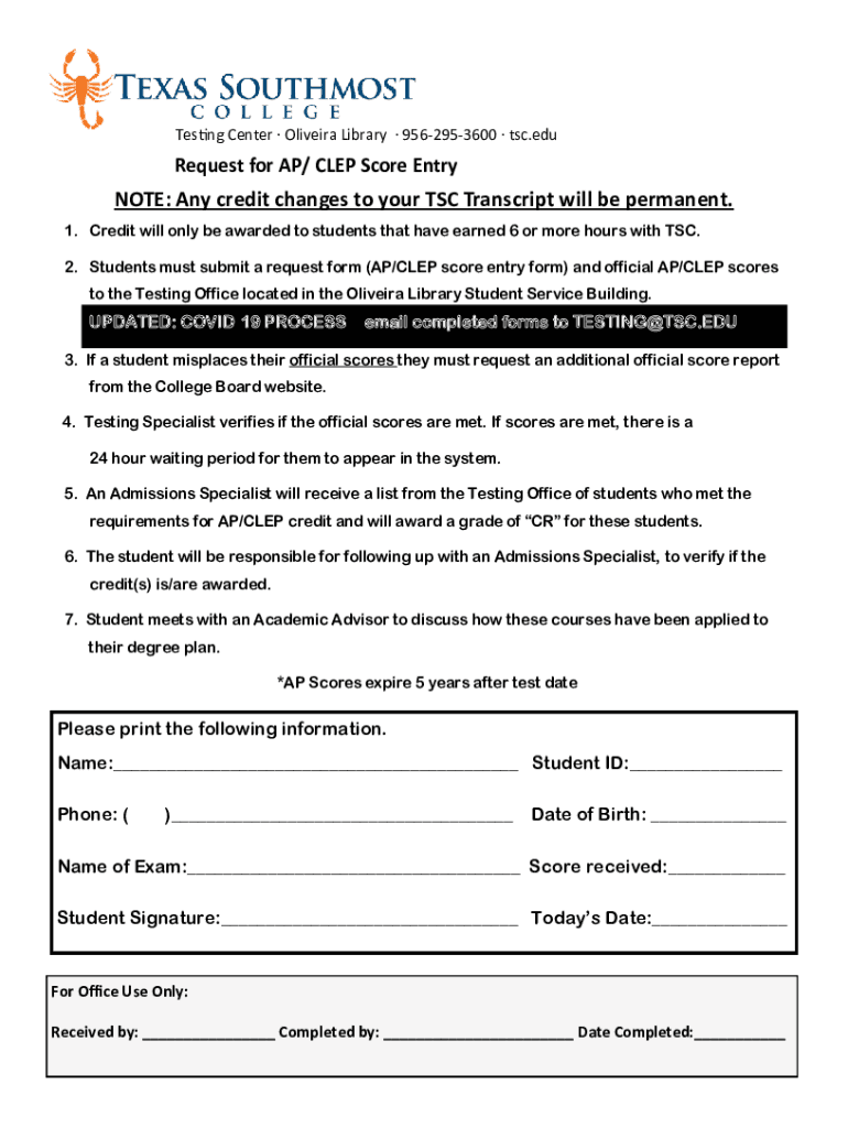 Testing Center Oliveira Library 9562953600 TSC.request for AP/ CLIP Score Entrecôte: Any credit changes to your TSC Transcript will be permanent. 1. Credit will only be awarded to students that have