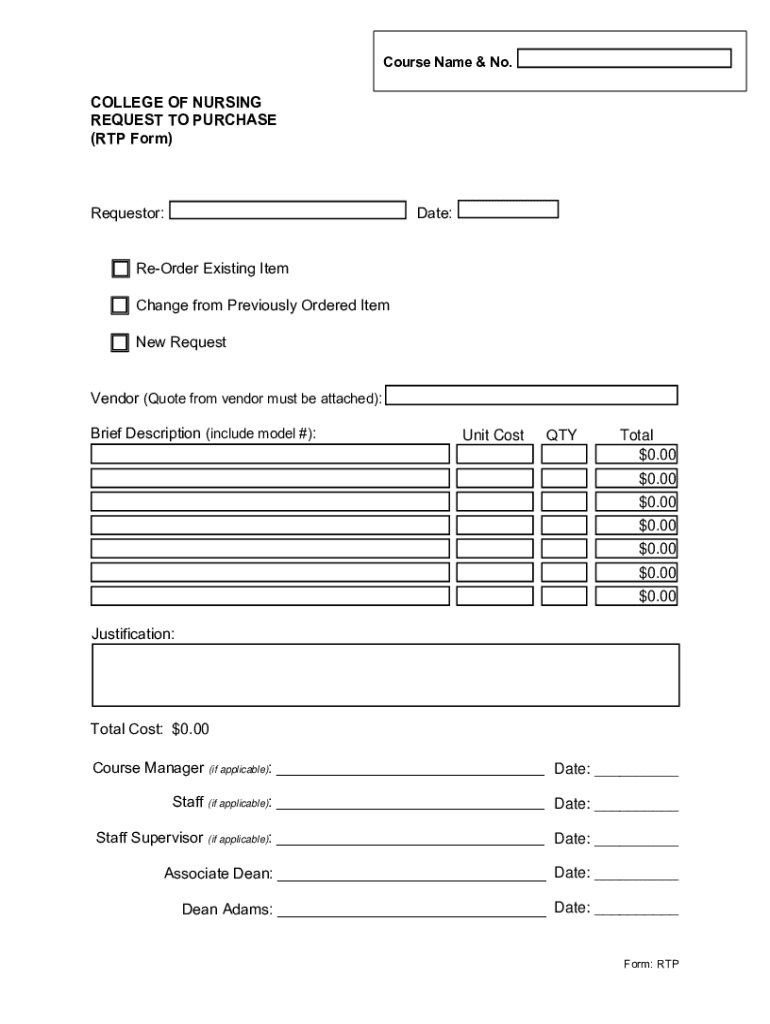 Course Name & No. COLLEGE OF NURSING REQUEST TO PURCHASE (RTP Form)Requestor: Date:Reorder Existing Item Change from Previously Ordered Item New Request Vendor (Quote from vendor must be attached):