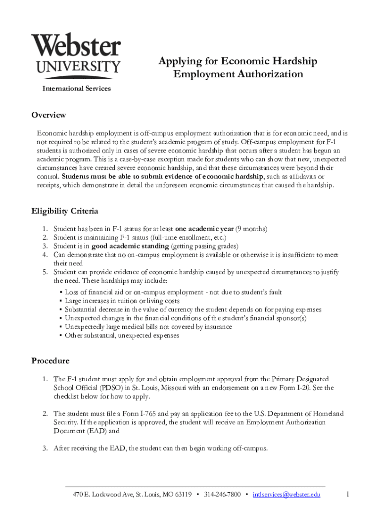 Get the free Severe Economic Hardship Employment for F-1 Students ...Economic Hardship Work Autho...