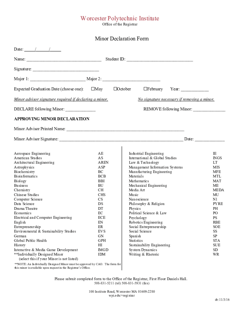 Worcester Polytechnic Institute Office of the RegistrarMinor Declaration Form Date: / / Name: Student ID: Signature: Major 1: Major 2: Expected Graduation Date (choose one):OctoberMinor advisor signature