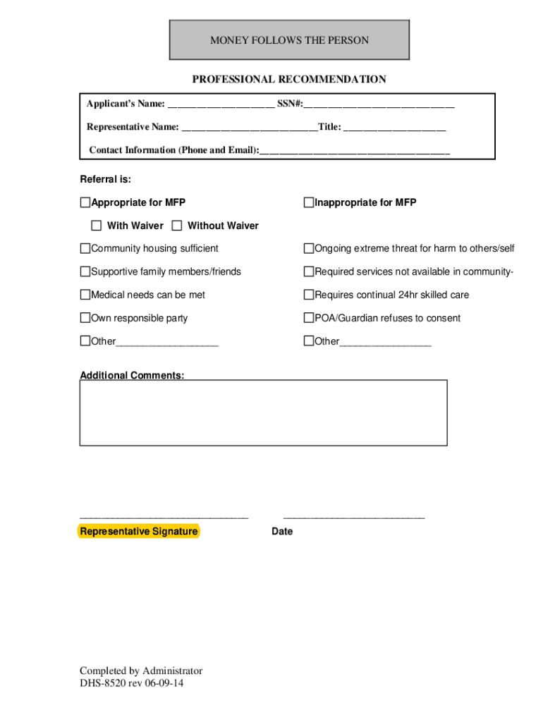 MONEY FOLLOWS THE PERSONPROFESSIONAL RECOMMENDATION Applicants Name: SSN#: Representative Name: Title: Contact Information (Phone and Email): Referral is: Appropriate for MFP With WaiverInappropriate