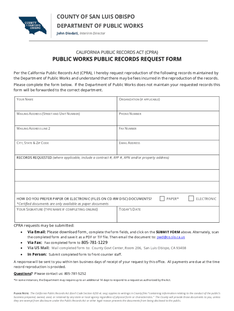 Get the free Public Works Public Records Request - County of San Luis Obispo