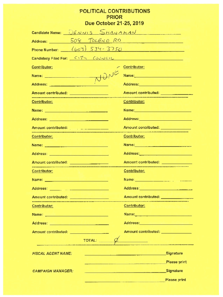 POLITICAL CONTRIBUTIONS PRIOR Due October 2125, 2019 Candidate Name:S1iA 1iAIJjA)J S1)LEAS address: Phone Number:((9c3)Candidacy Filed For: Contributor:C75E(? Y)? S?)(Uracil, Contributor:Name:Name: