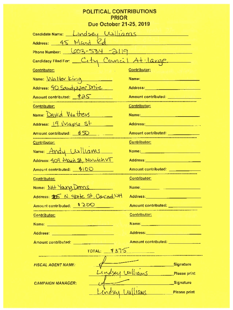 POLITICAL CONTRIBUTIONS PRIOR Due October 2125, 2019 Ut1i candidate Name:4Address:c&j24 19O54Phone Number:(14Candidacy Filed For:(L)JV,4%1. Contributor:Contributor:Name: j c t14Name: 4O SpY1vAddress:Address: