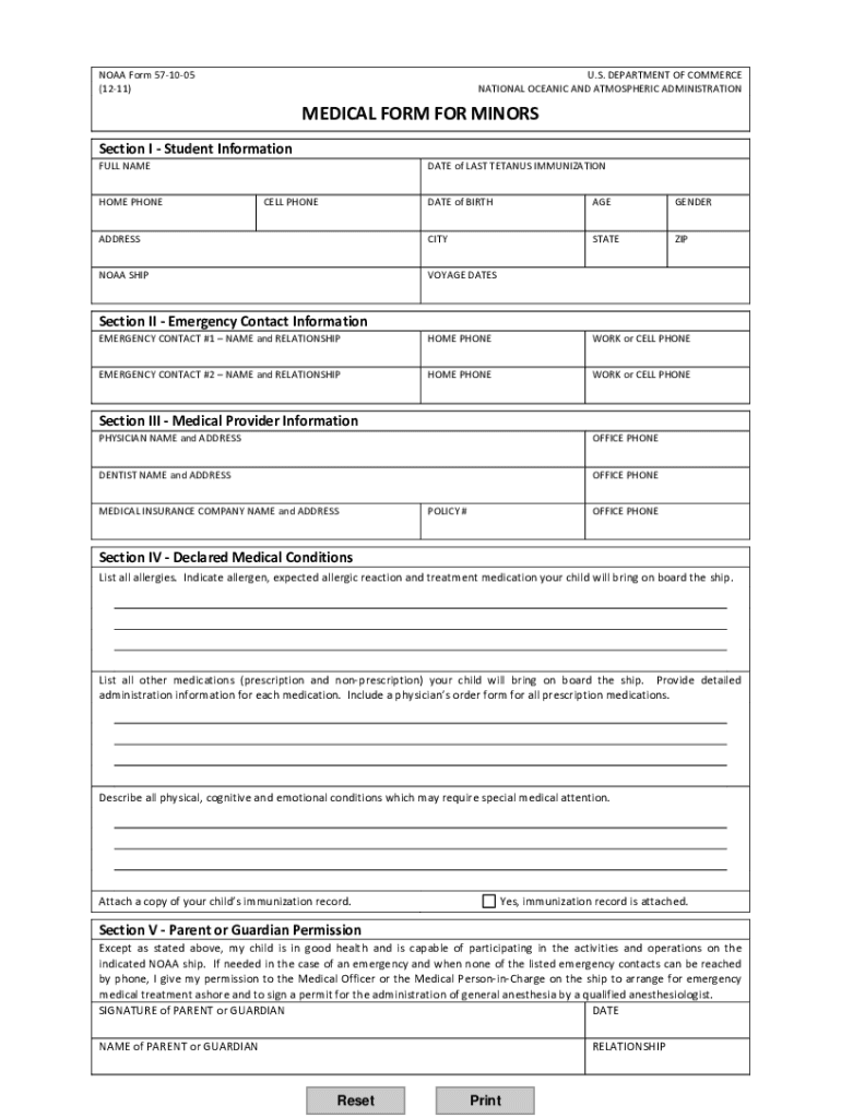 NOAA Form 571005 (1211)U.S. DEPARTMENT OF COMMERCE NATIONAL OCEANIC AND ATMOSPHERIC ADMINISTRATIONMEDICAL FORM FOR MINORS Section I Student Information FULL NAME HOME PHONED ATE of LAST TETANUS IMMUNIZATION