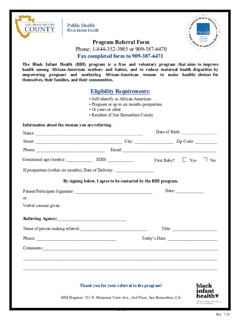 Program Referral Form Phone: 18443523985 or 9093876470 Fax completed form to 9093876471 The Black Infant Health (BIH) program is a free and voluntary program that aims to improve health among African