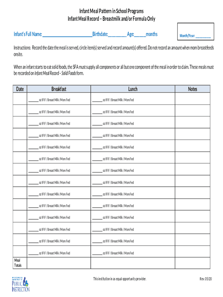 Infant Meal Pattern in School Programs Infant Meal Record Breast milk and/or Formula Only Infants Full Name: Birthdate: Age: monthsMonth/Year: Instructions: Record the date the meal is served, circle