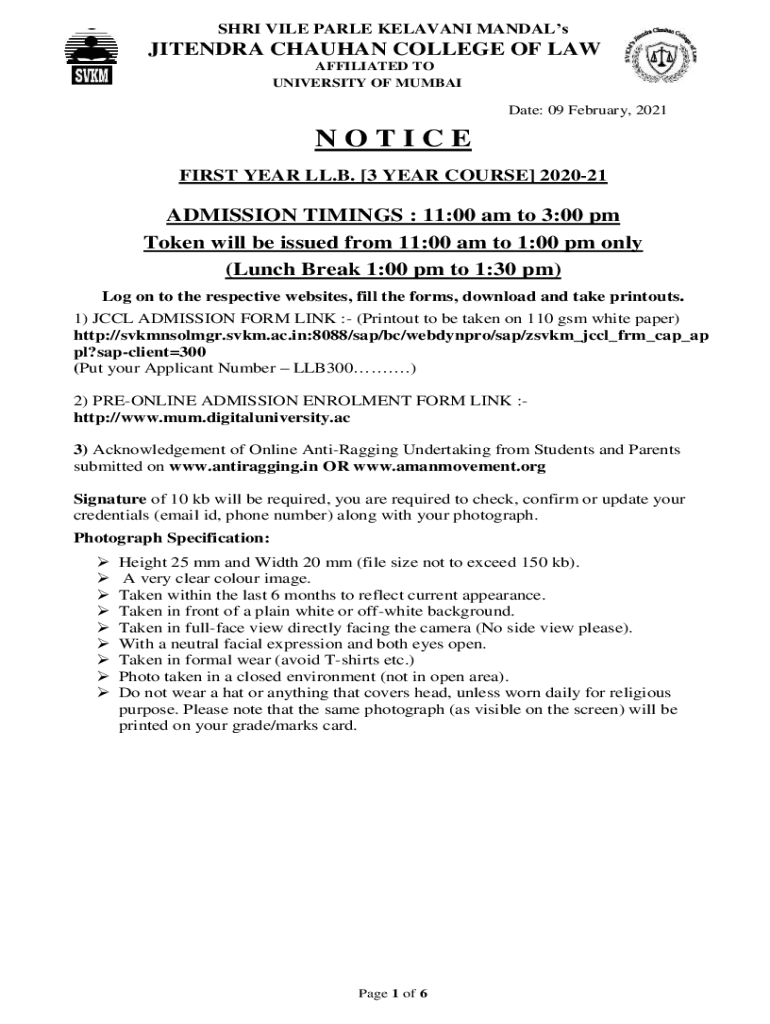 SARI VILE PALE RELEVANT MANDALsJITENDRA CHAUHAN COLLEGE OF LAW AFFILIATED TO UNIVERSITY OF MUMBAIDate: 09 February, 2021NOTICE FIRST YEAR LL.B. 3 YEAR COURSE 202021ADMISSION TIMINGS : 11:00 am to