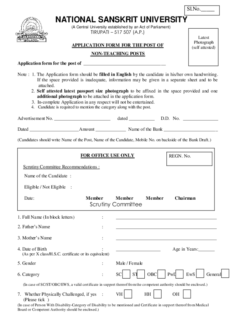 SL. No. NATIONAL SANSKRIT UNIVERSITY (A Central University established by an Act of Parliament)TIMPANI 517 507 (A.P.) The Latest Photograph (self attested)APPLICATION FORM FOR THE POST OF TEACHING