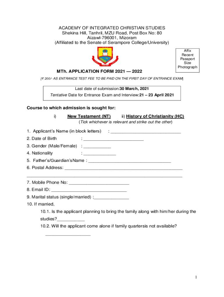 ACADEMY OF INTEGRATED CHRISTIAN STUDIES Seeking Hill, Tendril, MMU Road, Post Box No: 80 Aizawl796001, Mizoram (Affiliated to the Senate of Seaport College/University)MTV. APPLICATION FORM 2021 2022Affix