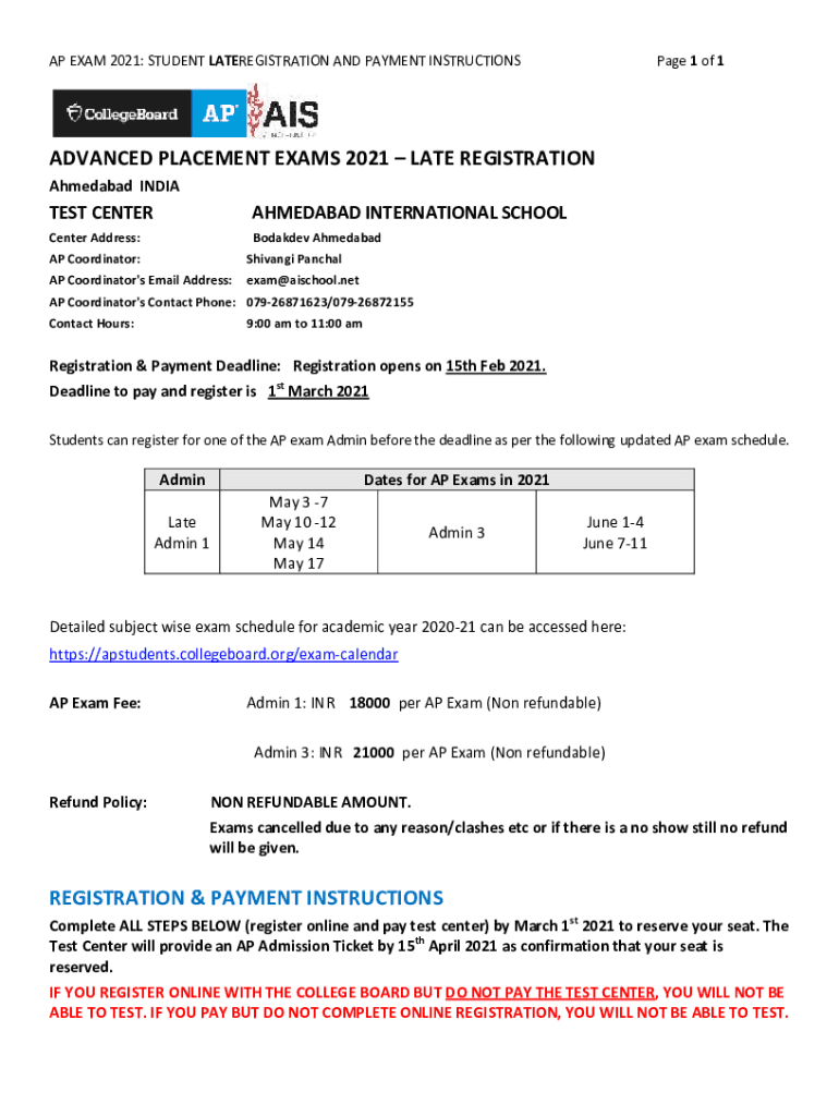 AP EXAM 2021: STUDENT PREREGISTRATION AND PAYMENT INSTRUCTIONS Page 1 of 1ADVANCED PLACEMENT EXAMS 2021 LATE REGISTRATION Ahmedabad INDICATES CENTERAHMEDABAD INTERNATIONAL Schoolmaster Address:Boarded
