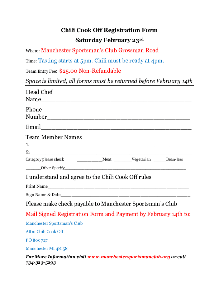 Chili Cook Off Registration Form Saturday, February 23rd Where: Time:Manchester Sportsman Club Grossman Broadcasting starts at 5pm. Chili must be ready at 4pm. Team Entry Fee:$25.00 NonRefundableSpace