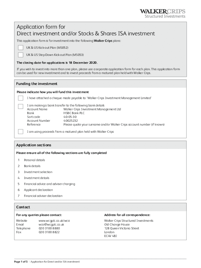 Application form for Direct investment and/or Stocks & Shares ISA investment This application form is for investment into the following Walker Crops plans: UK & US Sickout Plan (MS052) UK & US Step
