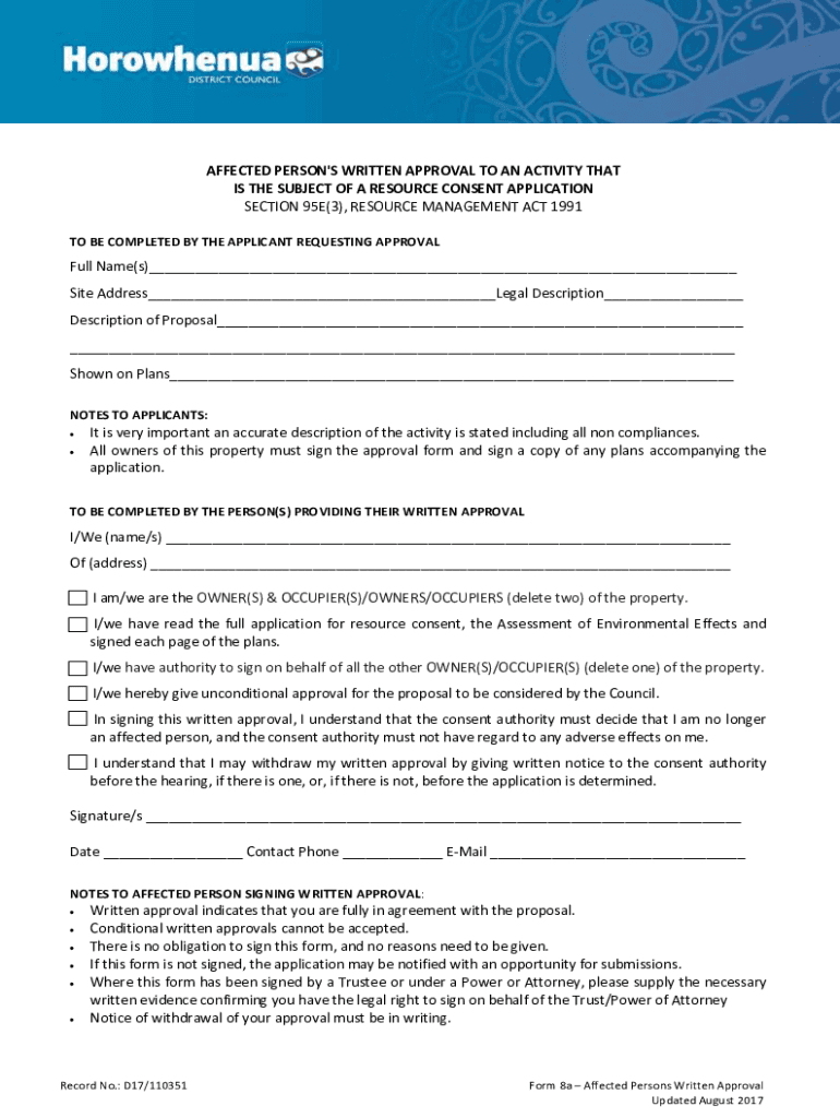 AFFECTED PERSON IS WRITTEN APPROVAL TO AN ACTIVITY THAT IS THE SUBJECT OF A RESOURCE CONSENT APPLICATION SECTION 95E(3), RESOURCE MANAGEMENT ACT 1991 TO BE COMPLETED BY THE APPLICANT REQUESTING APPROVALFull