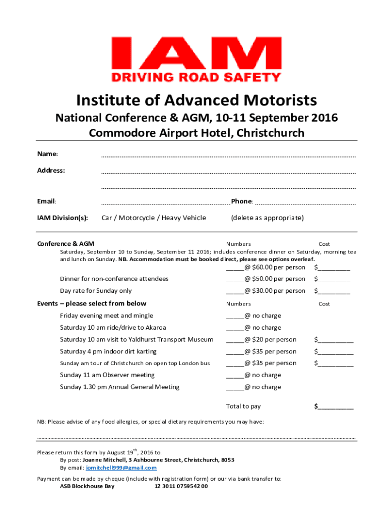 Institute of Advanced Motorists National Conference & AGM, 1011 September 2016 Commodore Airport Hotel, Christchurch Name: Address:Email:Phone:IAM Division(s):Car / Motorcycle / Heavy Vehicle(delete