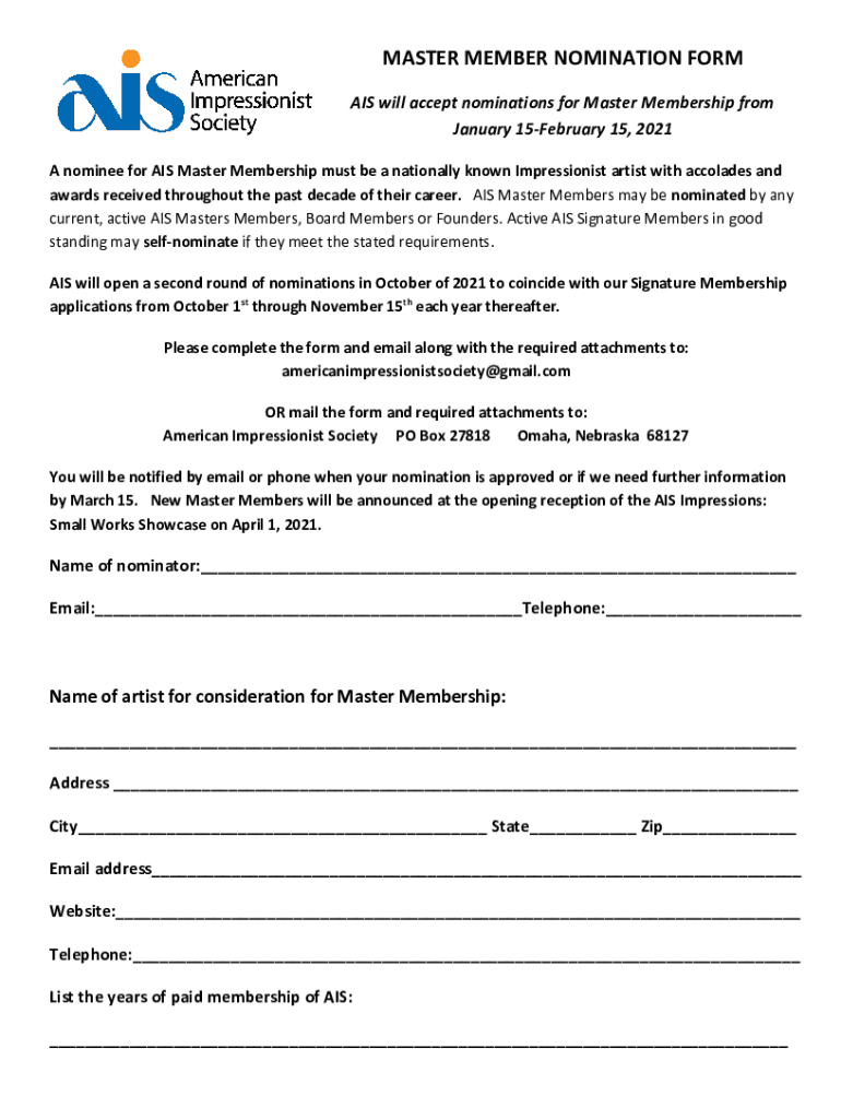 A nominee for AIS Master Membership must be a nationally known Impressionist artist